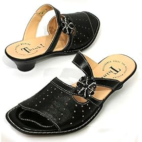 A comfortable slide with a unique ornamentation. Leather upper and lining. Lightly padded leather footbed for comfort.